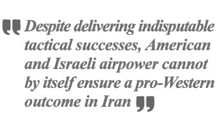 American air campaigns have a demonstrated history of obliterating Washington’s tactical targets and severely disrupting its adversaries. Iran is unlikely to prove an exception to this rule. However, air campaigns—no matter how sophisticated—cannot by themselves reorder domestic politics and build long-lasting political outcomes. It follows that, despite delivering a series of indisputable tactical successes, including the assassination of Iran’s supreme leader and senior members of his inner circle, American and Israeli airpower cannot by itself ensure a pro-Western outcome in Iran.