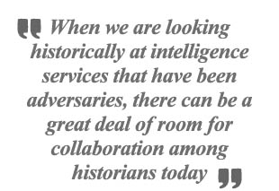 rests. Beyond that, I think that when we are looking historically at intelligence services that have been adversaries, there can be a great deal of room for collaboration among historians today. The obvious example that springs to mind is in understanding the intelligence aspects of the Cold War. There have been extensive declassifications in Eastern Europe and in the United States and some Western European countries. There have been significant involuntary releases of information from the Soviet Union. There is great potential for international collaboration. I’d also add that, with Iraqi intelligence records from the Saddam era starting to become available at the National Defense University’s Conflict Records Research Center, there is another opportunity for collaborative work to see what was going on on “both sides of the hill”.