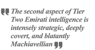 Emirati intelligence has to be seen in two disparate tiers: actual home-grown intelligence efforts, which usually revolve within the small policing and military forces of the United Arab Emirates (UAE); and more elaborate, highly secretive, outsourced activities that use the UAE as a facilitating conduit or go-between with a clear advantage to Emirati interests.