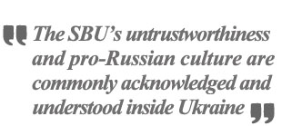By then, the SBU’s untrustworthiness was commonly acknowledged and understood in Ukraine. In fact, under the five-year rule of Ukraine’s pro-Russian President Viktor Yanukovych (2010–2014), the SBU effectively became a branch of Russian intelligence. During that time, the agency deliberately ignored —and may have even assisted— Russian espionage operations against Ukraine, as the Kremlin’s “intelligence agencies met no obstacles to the infiltration of the SBU and [Ukrainian] military intelligence”. Even after Yanukovych fled to Russia following massive popular pressure, the SBU remained the most pro-Russian part of Ukraine’s labyrinthine government.