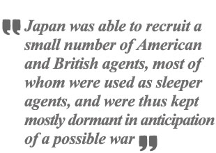 to recruit “a small number of American and British agents”, most of whom were used as so-called ‘sleeper agents’, and were thus kept mostly dormant in anticipation of a possible war between Japan and the United States. Few of them, however, were able to become fully operational prior to being arrested by American or Mexican counterintelligence.