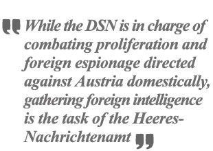 More importantly, it should be noted that, while the DSN is in charge of combating proliferation and foreign espionage directed against Austria domestically, gathering foreign intelligence is the task of the Heeres-Nachrichtenamt (HNaA). Naturally, in the course of fulfilling its duties, the DSN indirectly gathers and