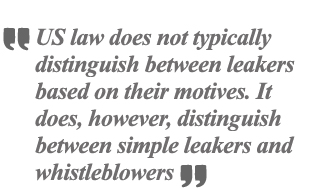 between leakers based on their motives. It does, however, distinguish between simple leakers and whistleblowers. If a US government employee uncovers evidence of abuse of power, or becomes aware of a specific and critical threat to the security of Americans, he or she is required to notify his or her superiors. If the latter refuse to take action, then the employee is justified under the law in taking all necessary actions to warn the public of impending peril. That is precisely the function of the 1989 Whistleblower Protection Act, which affords protection to insiders who expose abuses of authority, or a concrete and critical threat to public safety.